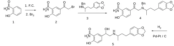 For the first step, salicylamide (1) is the subject of a Friedel-Crafts acetylation and then the aromatic methylketone is halogenated. in the usual manner. The bromide in 2 is then displaced by the nitrogen in N-benzyl-1-(3',4'-methylenedioxyphenyl)-3-butylamine (3), which is itself prepared by reductive amination on the corresponding ketone. The product of the last step (4) is catalytically hydrogenated. This serves the dual purpose both of reducing the ketone and removing the benzyl protecting group affording the product medroxalol (5). Note that a benzyl protecting group is not necessarily used.