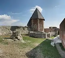 Medvedgrad (pronounced [mědʋedɡraːd]; Croatian for bear-town; Hungarian: Medvevár) is a medieval fortified town located on the south slopes of Medvednica mountain, approximately halfway from the Croatian capital Zagreb to the mountain top Sljeme. For defensive purposes it was built on a hill, Mali Plazur, that is a spur of the main ridge of the mountain that overlooks the city. On a clear day the castle can be seen from far away, especially the high main tower. Below the main tower of the castle is Oltar Domovine (Altar of the homeland) which is dedicated to Croatian soldiers killed in the Croatian War of Independence.[1][2]