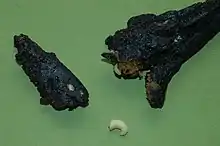 In the wild, M. campanulae seal off their cells within the nest with natural resins found in plants and trees. In 2013, however, researchers reported that the bees had used synthetics, including caulk, to seal the cells. Compositional analysis of these materials revealed calcium, titanium, and iron. They resembled polyurethane-based sealants typically used in building construction.[15] It is not uncommon for insects to live inside found objects made of plastic. However, these findings are the first known of insects actually building nests with plastic.[16] With help from citizen scientists in Toronto, over 200 nest boxes were placed throughout the city. Scanning electron microscopy, x-ray microanalysis, and infrared microscopy were employed in identification of polymeric specimens. Researchers suggest the bees' behavior may be an example of adaptive behavior.[17] Since some of the bees were free of parasites, these novel and possibly more robust methods of nest building may offer additional protection.[18] Incorporation of plastic into the walls and sealants of the cell nests appeared to provide some protection against brood parasite invasion. However, use of these more readily available synthetic materials, in an urban setting, may be incidental. In fact, exposure of brood to polyurethane and polyethylene based plastics could be detrimental, as the Canadian team noted, since diffusion of moisture could be inhibited. Some of the brood specimens were heavily affected by mold growth.[18] Additionally, synthetic materials in the nest might hinder the bees ability to move and breath.[15] Toxin exposures and other effects of urbanization are well documented contributors towards pollinator decline in general.[19]