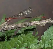 Megalagrion leptodemas, commonly referred to as the Crimson Hawaiian damselfly, is one of the rarest and most endangered Megalagrion species that is endemic to the island of Oahu in Hawaii.[1] It is currently labeled as endangered by the ESA[2] and critically endangered on the IUCN Red List.[3] The general biology of Crimson Hawaiian damselflies is similar to other narrow-winged damselflies. Megalagrion leptodemas used to be found in the mountains of Ko’olau and Wai'anae but is now only found in four watersheds in the Ko’olau Mountains.[1] The species is threatened by habitat loss and non-native species.[2] They have limited habitat and small, scattered populations which can affect their future population stability. Conservation efforts for this species should concentrate on both habitat management and control of invasive species.[1]
