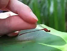 Megalagrion xanthomelas (orangeblack Hawaiian damselfly) is a species of damselfly in the order Odonata and the family Coenagrionidae.[2] The species was first found by G. F. Matthew and described in 1876 by Selys-Longchamps.[3] Classified as an endemic species, the Orangeblack Hawaiian Damselfly can only be found in the forests of the Hawaiian Islands.[4] Derived from a freshwater ancestor, the genus Megalarion consists of very diversified groups of damselflies that can grow between the lengths of 33 to 37 millimeters.[4][5] Megalagrion xanthomelas are commonly found in calm water sources throughout Hawaii including streams and ponds and is threatened by habitat loss. . Anchialine ponds are a common habitat for Megalagrion xanthomelas to live in which requires the species to adapt to mechanisms of osmoregulation, which helps maintain their internal fluids when the surrounding salinity of the water fluctuates.[5] Osmoregulation resulted in the species adapting behaviorally to finding habitats that have lower salinity levels.[5] Osmoregulation leads to an increase in diversity within the species causing western coast populations to adapt and be less sensitive to higher salinity habitats, creating a salinity tolerance, while eastern coast populations lack a high salinity tolerance.[5]