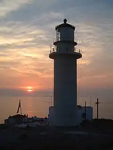 The Megalonisi Lighthouse, also erroneously called the Sigri Lighthouse, is a lighthouse located on the island of Megalonisi (Nisiopi), c. 1.5 kilometres (0.93 mi) west of the village Sigri near the western tip of the Greek island of Lesbos.[1] It is a circular tower standing 13.4 metres (44 ft) meters tall with its focal plane at a height of 53 metres (174 ft), and has an attached 1-storey keeper's house. The light was established in 1861 with oil as its energy source. The petroleum lantern was replaced by an electric light in 1989. The only time when the light was turned off was during the Second World War and it was repaired in 1945. It is still used today for navigation safety, and emits two white flashes every 15 seconds in a luminous range of 21 nautical miles.[2]