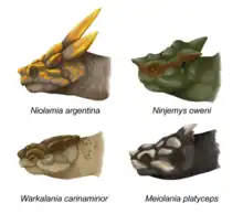 | Restoration of the head of various meiolaniid species | |