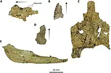 Fossils of Mekosuchus were initially recovered from various different sites across New Caledonia, with the first bone, a fragmentary quadratojugal, being collected from Kanumera Bay in 1981.[1] Subsequent years yielded more material stemming from both the Isle of Pines and the Pindai Caves on the main island of Grande Terre. This material included various cranial and postcranial remains, ranging from the complete holotype dentary to skull fragments and isolated vertebrae. Such fossils were first reported by Eric Buffetaut in 1983 and properly described by him and Jean-Christophe Balouet four years later in 1987. Due to the strange anatomy of the material, they initially assumed the animal represented an early eusuchian (at the time considered a suborder of Crocodylia) and placed it in its own family, the Mekosuchidae.[2][3] Ten years later, in 1997, a second species was described by Paul Willis from the Riversleigh World Heritage Area in Queensland. Named M. whitehunterensis, it was not only geographically separated from the type species but also distinctly older, dating to the Late Oligocene. This marked the first but not the last known instance of a Mekosuchus species being found on the Australian mainland, instead of on an island.[4] The second instance came only four years later with the description of Mekosuchus sanderi, also named by Willis.[5] The most recently described species is Mekosuchus kalpokasi, which was named in 2002 from fragmentary remains discovered at an archaelological site on Vanuatu.[6] A 2003 expedition also yielded additional remains of M. inexpectatus,[7] with additional fossils of M. whitehunterensis being found as well.[8][9][10]