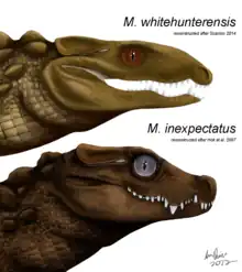 However, the differences in shape are more noticeable. The oldest species, M. whitehunterensis, was described as having smooth maxillary teeth that would display flattened sides towards the back of the jaw, making them blade-like.[4] A similar condition can be observed in the younger mainland species, M. sanderi, in which the teeth become laterally compressed following the 5th tooth of the maxilla.[5][6] The Holocene species meanwhile lack these blade-like teeth. Although only the tooth sockets are known from M. kalpokasi, these suggest that the teeth were circular to ovate in cross section, with no signs of the lateral compression seen in older forms. The teeth of M. inexpectatus are better known, but likewise fail to display the same condition as seen in the continental species. Rather than being blade-like, the posterior teeth of M. inexpectatus were bulbous molariforms, better suited for crushing than for slicing.[1] Similar tribodont teeth are seen in many unrelated types of eusuchians, including Allognathosuchus, Bernissartia and modern dwarf crocodiles.[2][6][7]