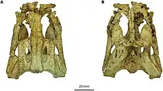The skull of Mekosuchus was brachycephalic or altirostral, meaning that it was notably short and raised rather than elonagted and flattened as seen in most extant crocodilian species. In this regard Mekosuchus has been compared to Trilophosuchus and the modern, only distantly related genus Osteolaemus, which includes the extant dwarf crocodiles.[13] Other researchers have also drawn comparisons between this genus and various other terrestrial crocodylomorphs including notosuchians.[3] Two reconstructions of the skull of Mekosuchus have been published, differing greatly from one another. Following the discovery of additional remains, Holt and colleagues reconstructed Mekosuchus inexpectatus in 2007 with a skull similar to that of modern dwarf crocodiles.[7] In 2014 on the other hand, Scanlon produced a composite skeletal for the skull of M. whitehunterensis, reconstructing it with a much more gently sloping rostrum that differed greatly from the previous depiction of the genus.[9]