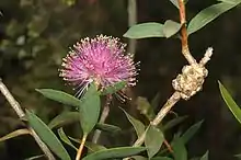 The flowers are a shade of pink to purple and arranged in heads or short spikes on the ends of branches which continue to grow after flowering, sometimes also in the upper leaf axils. The heads are up to 30 mm (1 in) in diameter and contain between 10 and 15 groups of flowers in threes. The stamens are arranged in bundles of five around the flower, with 9 to 11 stamens in each bundle. The flowering season is November and December and is followed by fruit which are woody capsules 3.5–4 mm (0.1–0.2 in) long in an oval-shaped cluster around the stems.[2][3]