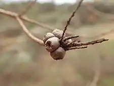 The flowers are a shade of pink to purple and arranged in heads on the ends of branches which continue to grow after flowering, sometimes also in the upper leaf axils. The heads are up to 25 mm (1 in) in diameter and contain between 3 and 6 groups of flowers in threes. The stamens are arranged in bundles of five around the flower, with 8 to 13 stamens in each bundle. The flowering season is from October to December and is followed by fruit which are woody capsules, 3–5 mm (0.1–0.2 in) long in clusters. The clusters do not form a football shape as in some similar melaleucas.[1][2]