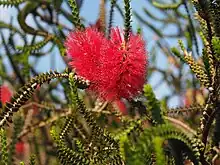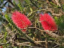 The flowers are brilliant red, arranged in bottlebrush-like spikes, 40–80 mm (2–3 in) long and about 50 mm (2 in) diameter on side branches. The petals are 3–4.5 mm (0.1–0.2 in) long and fall off soon after the flower opens. The stamens, which give the flowers their colour, are arranged in five bundles, each containing 11 to 15 stamens. Flowers appear in spring and summer and are following by fruit which are hairy, woody capsules 3.5–5 mm (0.1–0.2 in), tightly clustered in a cylindrical group.[2][3]