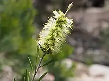 Melaleuca flavovirens, commonly known as green bottlebrush is a plant in the myrtle family, Myrtaceae and is endemic to a small area near the New South Wales–Queensland border in Australia. (Some Australian state herbaria continue to use the name Callistemon flavovirens.)[2] It is a stiff shrub, distinguished by its silvery new growth and spikes of greenish flowers with yellow tips.
