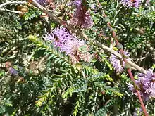 The flowers are mauve, in dense, cylindrical spikes about 15 mm (0.6 in) long, containing up to about ten pairs of flowers. The stamens are conspicuous, 3.5–5.5 mm (0.1–0.2 in) long and arranged in five bundles around each flower, each with between 5 and 25 stamens. Flowers appear mainly in November to December but often appear at other times of the year. The fruit are woody capsules, about 5 mm (0.2 in) across but wider at the base where they become embedded in the woody stem. The seeds are retained in the capsules until the plant, or that part of it, dies.[2][3][4]