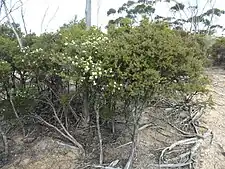 The flowers are white to pale yellow and arranged in hemispherical heads, mostly on the ends of branches which continue to grow after flowering but sometimes also in the upper leaf axils. The heads are about 18 mm (0.7 in) in diameter and contain 3 to 10 individual flowers. The petals are 1.7–3 mm (0.07–0.1 in) long and fall off as the flower matures. The stamens are arranged in five bundles around the flower, each bundle containing 10 to 18 stamens. Flowering occurs in spring and early summer and is followed by fruit which are woody, barrel-shaped capsules more or less scattered along the branches.[6][7]