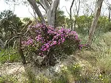 The flowers are a shade of pink or purple. They are arranged in heads near the ends of branches which continue to grow after flowering and also in some of the upper leaf axils. The flower buds are covered with brown bracts. The bracts, flower bases (hypanthia) and sepals are all covered with white fluff. Each head contains up to 5 groups of flowers in threes and is up to 17 mm (0.7 in) in diameter. The stamens, which give the flowers their colour, are arranged in 5 bundles around the flower, with 5 to 8 stamens in each bundle. The flowers mainly appear from September to December and are followed by fruit which are woody capsules 2.5–3.5 mm (0.1–0.1 in) long in clusters around the stem.[2][3]