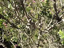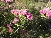 The flowers are a shade of pink, arranged in heads on the ends of most of the branches which continue to grow after flowering and sometimes also in the upper leaf axils. The heads are up to 25 mm (1 in) in diameter and contain 8 to 15 groups of flowers in threes. The petals are 2.5–3.3 mm (0.098–0.13 in) long and fall off as the flower matures. There are five bundles of stamens around the flower, each with 5 to 9 stamens. Flowering occurs in spring and is followed by fruit which are woody, cup-shaped capsules, 2.5–4 mm (0.1–0.2 in) long and usually in almost spherical clusters along the stem.[2][3]