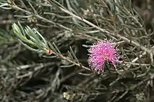 The flowers are a shade of pink or purple, arranged in heads on the ends of branches which continue to grow after flowering and sometimes also in the upper leaf axils. The heads are up to 20 mm (0.8 in) in diameter and contain two to six groups of flowers in threes. The outer surface of the flower cup (the hypanthium) is silky-hairy. The petals are 1.2–2 mm (0.05–0.08 in) long and fall off as the flower matures. Five bundles of stamens are seen around the flower, each with seven to nine stamens. Flowering occurs between August and January and is followed by fruit which are woody capsules, 3–4.5 mm (0.1–0.2 in) long and usually in small clusters along the stem.[2][3]