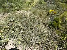 The flowers are yellow to lime-green and arranged in heads on the sides of the branches. Each head contains 5 to 15 individual flowers and is up to 45 mm (1.8 in) in diameter. The petals are 4.5–6.5 mm (0.18–0.26 in) long (compared to 3–3.7 mm (0.12–0.15 in) in M. longistaminea) and fall off as the flowers mature. The stamens are arranged in five bundles around the flowers and there are 9 to 24 stamens per bundle. The flowering period is from August to late November and is followed by fruit which are woody capsules 3.5–6.5 mm (0.14–0.26 in) long with teeth around the edges and in clusters along the branches.[2][3][4]