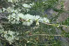 The creamy-white flowers are arranged in spikes at the ends of branches which continue to grow after flowering and sometimes also in the upper leaf axils. The spikes are up to 20 mm (0.8 in) in diameter and contain 8 to 23 pairs of flowers. The outer surface of the flower cup (the hypanthium) is hairy and the five petals surrounding it are 2.2–3 mm (0.09–0.1 in) long and fall off as the flower matures. The stamens are arranged in bundles of five around the flower, with 16 to 27 stamens in each bundle. The flowers appear between January and April and also in November and are followed by fruit which are woody capsules 2–4 mm (0.08–0.2 in) long, mostly scattered along the branches.[2][3]
