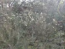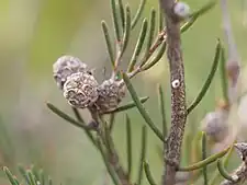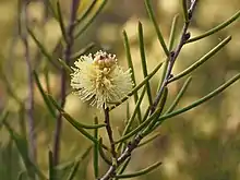 The flowers are cream coloured to bright yellow and are arranged in heads on the ends of branches which continue to grow after flowering and sometimes also in the upper leaf axils. The heads are up to 18 mm (0.7 in) in diameter with 2 to 13 groups of flowers in threes. The petals are 1.0–2.2 mm (0.04–0.09 in) long and fall off as the flower matures. The outer surface of the floral cup (the hypanthium) is hairy and there are five bundles of stamens around the flower, each with 6 to 8 stamens. Flowering occurs mainly in spring and is followed by fruit which are woody capsules, 2.0–2.5 mm (0.08–0.1 in) long, packed tightly together in spherical or oblong clusters.[2][3]