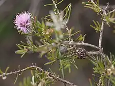 The flowers are pinkish to purple and are arranged in heads on the ends of branches which continue to grow after flowering and sometimes also in the upper leaf axils. The heads are up to 17 mm (0.7 in) in diameter with 4 to 12 groups of flowers in threes. The petals are 1.0–1.5 mm (0.04–0.06 in) long and fall off as the flower matures. The outer surface of the floral cup (the hypanthium) is hairy and there are five bundles of stamens around the flower, each with 3 to 6 stamens. Flowering occurs from July to October and is followed by fruit which are woody capsules, 2.5–3.0 millimetres (0.098–0.12 in) long, packed tightly together in spherical or oblong clusters.[2][3]