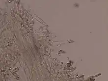 The spores of Melanoleuca are 7.0–11.0 x 4.0–6.0 µm, thin-walled, ellipsoid, amyloid with ornamented warts. They look very similar to the spores of Leucopaxillus, however, Melanoleuca spores present a plage. Basidia are usually 4-spored, cylindrical to clavate. Pleurocystidia and cheilocystidia may be present or absent; if present they are urticoid and thin-walled or fusiform to lageniform and thick-walled. They can have crystals incrusted at the apex. Cystidia are very important to separate species within this genus. The pileipellis is a trichoderm, sometimes a cutis. The hymenophoral trama is parallel. Clamp connections are absent in all parts of the fruit body.[4][5]