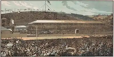 The inaugural Melbourne Cup of 1861 was an eventful affair when one horse bolted before the start, and three of the seventeen starters fell during the race, two of which died. Archer, a Sydney outsider who drew scant favour in the betting, spread-eagled the field and defeated the favourite, and Victorian champion, Mormon by six lengths. Dismissed by the bookies, Archer took a lot of money away from Melbourne, 'refuelling interstate rivalry' and adding to the excitement of the Cup.[29] The next day, Archer was raced in and won another 2-mile long-distance race, the Melbourne Town Plate.