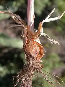 Melica spectabilis is a perennial grass which varies in maximum height from under 10 centimetres (3.9 in) to nearly a meter, growing from rhizomes and stalked, onionlike corms. The inflorescence is a narrow series of spikelets which are green with evenly spaced purple bands.