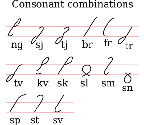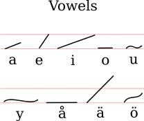 The basic forms of the Melin System are the consonants, vowels, and combinations. In addition there are a large number of ending forms as well as abbreviations. The basic forms are shown below: