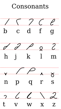 Some of the vowels and consonants have the same shapes, but they are distinguishable from their context, as vowels are always written from the bottom up and consonants from the top down.