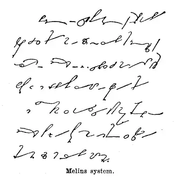 The Melin system of shorthand is the dominant shorthand system used in Sweden. It was created by Olof Melin (1849–1940), an officer in the Swedish Army.[1][2] He was a teacher of the Gabelsberger shorthand system in the Swedish army, but he was dissatisfied with it so he created an alternate system, that today is known as the Melin System.