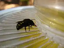 When a cell has been completed, the queen will fixate on the cell for inspection and push away workers from the cell. A worker will provision food into the cell and quickly retreat. Sometimes, when the queen is not around, a worker will lay an egg in the cell and quickly retreat from the area similar to when provisioning cells. During worker oviposition, or egg laying, the worker will be quiet with her wings closed and keep her body completely still as not to attract the queen. Worker oviposition will last an average of 7 seconds.[7] A worker's egg is about 2⁄3 the size of eggs laid by the queen.[7]