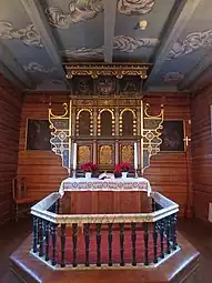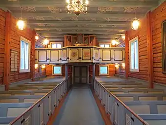The new building was a wooden long church with a choir on the east end of the nave. The new church was consecrated on 24 October 1728. In 1737, Alstrup sold the church to Captain Christian von Barnholdt. In 1767, a tower was built on the church. In 1828, the Løvenskiold family purchased the church. In 1840, the old tower was removed and a new, larger tower was built on the west end of the nave. A church porch is located beneath the tower and that is used as the main entrance to the church. In 1854, the local municipality took ownership of the church which had been privately owned since 1723. In 1883, the pews were changed, and the church got new windows and a new baptismal sacristy. In 1897, the interior walls were paneled to cover up the log construction and the ceiling was changed. In 1970–1976 the interior was restored and the wall paneling was removed.[4]