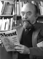 Soon after, Lasky received Marshall Plan funding to create the German-language journal Der Monat ("The Month"), airlifted into Berlin during the 1948 Soviet blockade. Its purpose was to support U.S. foreign policy and win over German intellectuals views that were socially progressive but anti-communist.[9] Der Monat continued as a prominent highbrow Germanophone journal, incorporating essays and articles from many Western European and North America intellectuals as well as dissidents from the Eastern Bloc. Contributors included Theodor Adorno, Hannah Arendt, Franz Borkenau, Thomas Mann, Arthur Koestler, Raymond Aron, Ignazio Silone, Heinrich Böll, Hans Sahl, Max Frisch, T. S. Eliot, Saul Bellow, Milovan Djilas, Richard Löwenthal, Peter de Mendelssohn, Hilde Spiel, and Hermann Kesten. The journal also received funding from the Ford Foundation and the CIA. According to CIA official Ray S. Cline the journal "would not have been able to survive financially without CIA funds".[10][11]