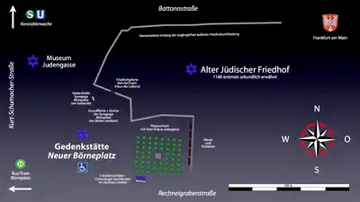 The Neuer Börneplatz is a pedestrian zone. The memorial site and the Museum Judengasse are accessible from both Battonnstraße and Rechneigrabenstraße.