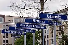 Five symbolic street signs at the Rechneigrabenstraße indicate the changing names of the Börneplatz, whose shape also changed over time.[7] The different names are associated with phases in Frankfurt's history – or with steps in the evolution of the city's commemoration policy.