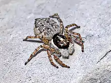 Genetic analysis has shown that the genus is related to the genera Helvetia and Phintella.[7] Previously placed in the tribe Heliophaninae, the tribe was reconstituted as Chrysillini by Wayne Maddison in 2015.[8] The tribe is ubiquitous across most continents of the world.[7] it is allocated to the subclade Saltafresia in the clade Salticoida.[9] In 2016, Prószyński created a group of genera named Menemerines after the genus.[10] The vast majority of the species in Menemerines are members of the genus, with additional examples from Kima and Leptorchestes.[11] The species name derives from the Latin for quiet, modestus.[12]