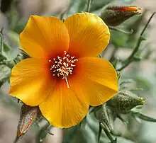 The inflorescence is a cluster of flowers with orange to yellow petals up to 2 centimeters long and often marked with red near the bases. At the center of the flower are many whiskery stamens. The fruit is a narrow, straight utricle up to 3.5 centimeters long which contains many tiny, angular seeds.