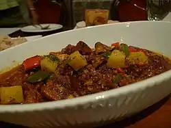 Menudo (from Spanish: "small [bits]"), also known as ginamay or ginagmay (Cebuano: "[chopped into] smaller pieces"), is a traditional stew from the Philippines made with pork and sliced liver in tomato sauce with carrots and potatoes.[1] Unlike the Mexican dish of the same name, it does not use tripe, hominy, or red chili sauce.[2]