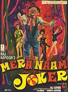 Mera Naam Joker (transl. "My Name is Joker") is a 1970 Indian romantic drama film, directed, edited and produced by Raj Kapoor under his banner R. K. Films, and written by Khwaja Ahmad Abbas. The film stars Raj Kapoor as the eponymous character, with his son Rishi Kapoor making his screen debut playing his younger version, along with Simi Garewal, Kseniya Ryabinkina, Padmini, Manoj Kumar and Dharmendra in supporting roles. The plot focuses on a clown who must make his audience laugh at the cost of his own sorrows; three women who shaped his life view his final performance.