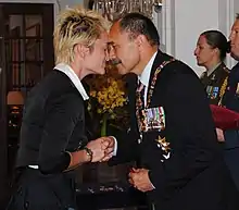![]() Kawharu and the governor-general, Sir Jerry Mateparae, hongi at her investiture as a Member of the New Zealand Order of Merit in 2012 | |