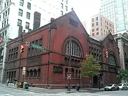 Mercantile Trust and Deposit Company is a historic bank building in Baltimore, designed by the Baltimore architectural firm of Wyatt and Sperry and constructed in 1885. It has a brick-with-stone-ornamentation Romanesque Revival structure, with deeply set windows, round-arch window openings, squat columns with foliated capitals, steeply pitched broad plane roofs, and straight-topped window groups. The interior features a large banking room with a balcony, Corinthian columns and ornate wall plaster work.[2]