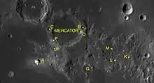 Mercator is a lunar impact crater that is located on the southwestern edge of Mare Nubium, in the southwest part of the Moon. It was named after 16th-century Southern Dutch cartographer Gerardus Mercator.[1] It is located to the southeast of the crater Campanus, and the two are separated by a narrow, winding valley.