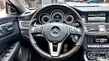 Standard equipment includes bi-xenon headlights, 18-inch alloy wheels, dual zone automatic climate control, power sunroof, and satellite navigation with a 10GB hard-drive.[19] Standard safety equipment consists of anti-lock brakes, electronic stability control, active head restraints, and 10 total front, side, and knee airbags.[20] CLS models also come with driver fatigue detection and lane departure warning system functions as standard.[21] Available options include Mercedes' AIRMATIC air suspension, traffic sign recognition, and a reversing camera in conjunction with the COMAND APS system.[22][23]