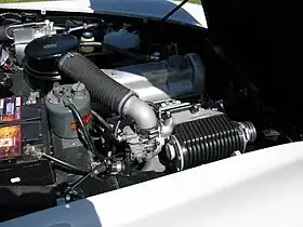The M121 engine was distinctive during its time due to the fact that it stood upright in the engine compartment, and not at an angle like the 300SL's. Looking under the hood, one will notice a series of cast aluminum plenums. A circular air cleaner is mounted on the bulkhead. The aluminum plenums channel air from the air cleaner to the carburetors. Under the carburetors lie a 4 to 1 exhaust manifold.[2]