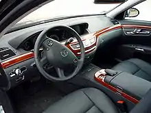 Inside, the W221's interior is also significantly different from the preceding model, even more dominated by leather, wood and metal. Where the W220 still had a fair amount of plastic fascias and switches, the W221 has replaced most of these by more luxurious materials such as wood, leather and metal. The interior features an instrument cluster with two large flat panel screens, one for the hard disk based COMAND system which includes the navigation screen and one replacing the analog speedometer by a graphical representation of it, which can display a range of additional information and can also be replaced by the Night View Assist display. Below the central COMAND screen are silver effect air vents, and a square, analog clock within the vents. Below the vents are metal tab switches with a black field behind them, to control the HVAC system (these functions are all also accessible via the COMAND system, which also offers access to some additional HVAC functions, such as foot-well temperature settings and air flow control).