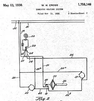 Walter M. Cross invented a hot-air furnace system with three main elements: (1) a motor driven stoker for feeding fuel to the combustion chamber of a furnace, (2) a room thermostatic switch for controlling the feeding of fuel, and (3) a combustion stoker switch to prevent the fire's going out in warm weather not requiring domestic heating. The room thermostat the supply of heat, or discontinues its supply, by closing or opening the circuit to the stoker motor at the required temperatures. The combustion stoker switch, or holdfire control, responds to a low temperature in the furnace by causing the stoker to feed fuel so as to prevent the furnace fire from going out. The control of the combustion stoker switch is effective in mild weather when the room thermostat may not call for heat for a considerable period.[8]