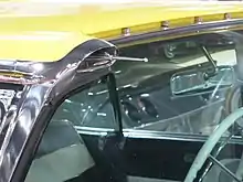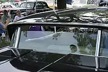While sharing much of its body with the Montclair, the Turnpike Cruiser was distinguished by several exterior design features. Although not legalized across the entire United States until 1958, "Quadri-Beam" dual headlamps were fitted as standard equipment (the only 1957 Mercury to do so, as well as one of very few cars from that year to be equipped as such); for states that still mandated single headlights a standard setup was used. In place of contrasting paint, the scalloped tailfins were gold-anodized. Along with its retractable "Breezeway" rear window, the Turnpike Cruiser received a separate roofline, with a windshield curving into the roof;[21] the windshield was among the first to use tint to reduce solar glare.[14] As a consequence of the compound-curve design of the windshield, Mercury added rooftop ventilation intakes to the Turnpike Cruiser to cover a body seam, and unusually in a secondary function, each intake also housed a fake radio antenna, as the functional radio antenna was mounted on the passenger side front fender.[21] Air conditioning and power side windows were additional cost options.[22] For 1958, the Turnpike Cruiser adapted the styling changes of the Montclair and Monterey, shifting the grilles into the front bumper. The rear fascia saw multiple changes, as the gold-anodized trim was removed from the scalloped fins; "rocket-style" taillamps were added.[23] To distinguish the model line from the Montclair (and Park Lane), the Turnpike Cruiser was given gold trim for its badging (including the Mercury "M" grille badge).