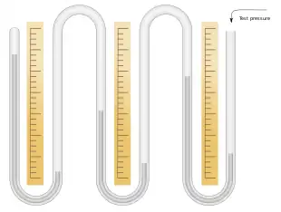 The pressure is determined by measuring the difference in height between the reference column and the column connected to the item under test. Calibration marks are usually provided to aid in this measurement and in laboratories a cathetometer might be employed for accuracy.[4] When relative pressure is being measured the difference may be negative, meaning the test pressure is below the reference pressure.[5] The ubiquity of this instrument led to mmHg becoming a common unit of measure of pressure. It is also related to another unit of pressure, the torr. The mmHg is not an SI unit but is still sometimes found in use, particularly in medicine.[6] In SI units, 1 mmHg is approximately 133 Pa .[7]