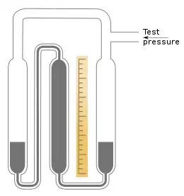 In 1938, Adolph Zimmerli (1886–1967)[9] invented a gauge that overcame the filling problems, at least for pressures below ambient pressure.[10] Zimmerli's gauge consists of three relatively wide columns. Referring to the diagram, the columns in the centre and on the right function as a standard U-tube gauge. Additionally, the top of the centre column is connected to the bottom of the third column on the left with a capillary tube. The centre column is initially completely filled with mercury, as is the connecting capillary. The other two columns are partially filled. The top of both the main column on the right and the reservoir column on the left are connected together and to an inlet for the pressure to be measured. When the test pressure is applied, the mercury rises in both the left and right columns and falls in the centre column. The mercury at the top of the capillary breaks and a vacuum forms there. The pressure is then measured in the usual way by the difference between the heights of the right and centre columns.[11]