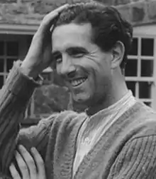 Evans' interest in Welsh music developed during his studies at Bangor, under the influence of Mrs. Enid Parry.[9] He began a career as a solo folk singer and also formed a close harmony group, Triawd y Coleg, with Cledwyn Jones and Robin Williams.[9] The trio became a popular act on stage, performing songs written mainly by Evans including "Triawd y Buarth" (The Farmyard Trio).[5][nb 1] After coming to the attention of BBC producer Sam Jones, Triawd y Coleg were recruited to be the stars of the Welsh-language light entertainment radio programme Noson Lawen.[11] Broadcast monthly from Bangor, each edition of the show was bookended by performances by the group; they were nurtured by Jones, who was known to lock Evans in a room until he produced words for a tune.[12] Noson Lawen brought Triawd y Coleg's humorous and sentimental songs to audiences across Wales and made them household names.[13] At one point it was estimated that 20% of the Welsh population listened to the programme.[3] The group were the first musical performers in the Welsh-language achieve fame through the medium of radio, and their success made Evans a household name.[14][15] Triawd y Coleg starred in a short film based upon the programme in 1950, with Evans playing a farmer's son who dreams of greater things.[9][16] During the 1960s, Triawd y Coleg recorded a series of singles and EPs for Welsh Teldisc and, in the 1970s, made two albums for Sain.[17]