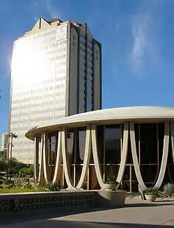 The Meridian Bank Tower (originally known as the Guaranty Bank Building) is a high-rise building in Phoenix, Arizona. It is an office building designed in international style and constructed between 1959 and 1960 for developer David H. Murdock. Upon completion, it became the city's tallest building, taking that 31 year distinction away from the Westward Ho which opened in 1929.[6] The Phoenix Corporate Center, a 26-story office building, was completed just a few years later in 1965 claiming the title as the city's tallest building.[7] There is a 20 feet (6.1 m) by 20 feet (6.1 m) sign on the north and south sides with a Meridian Bank logo.[8] The exterior was remodeled in the late 1980s which substantially changed the building's appearance.
